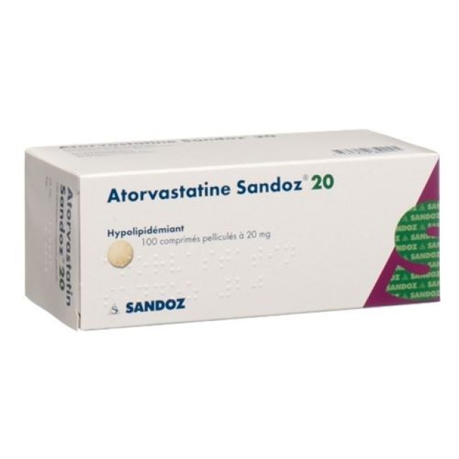 - Аторвастатин Сандоз 20 мг: упаковки по 30 и 100 таблеток, покрытых оболочкой.