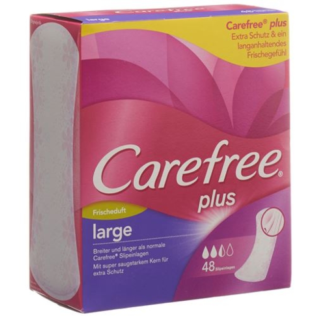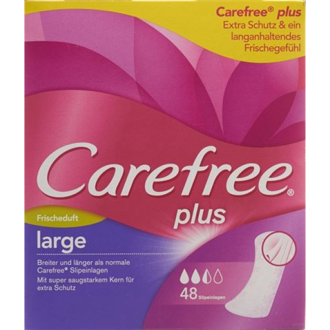 С Carefree Plus Large Fresh ежедневные салфетки с легким ароматом свежего белья дольше вы будете чувствовать себя защищенной и свежей. Благодаря тому, что они длиннее и шире, чем обычные стельки, они обеспечивают до 12 часов защиты от запаха, причем уникальный, absorbent сердечник жидкостей включая надежны.