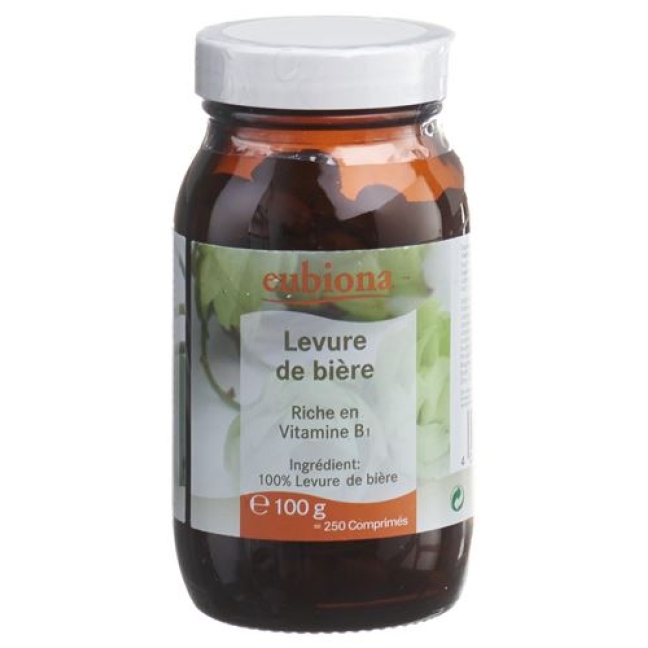 На Eubiona пивные дрожжи таблетки, состоящие из 100% пивные дрожжи, пищевая добавка с высоким содержанием натурального витамина В1, а также богат еще витаминами группы в, минералы, микроэлементы и белок.