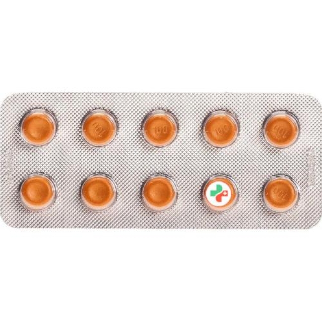 Таблетки от оранжевого до медного цвета, блестящие металлические, круглые, двояковогнутые, покрытые пленочной оболочкой таблетки диаметром 9 мм, с указанием силы дозы «100» на одной стороне таблетки.