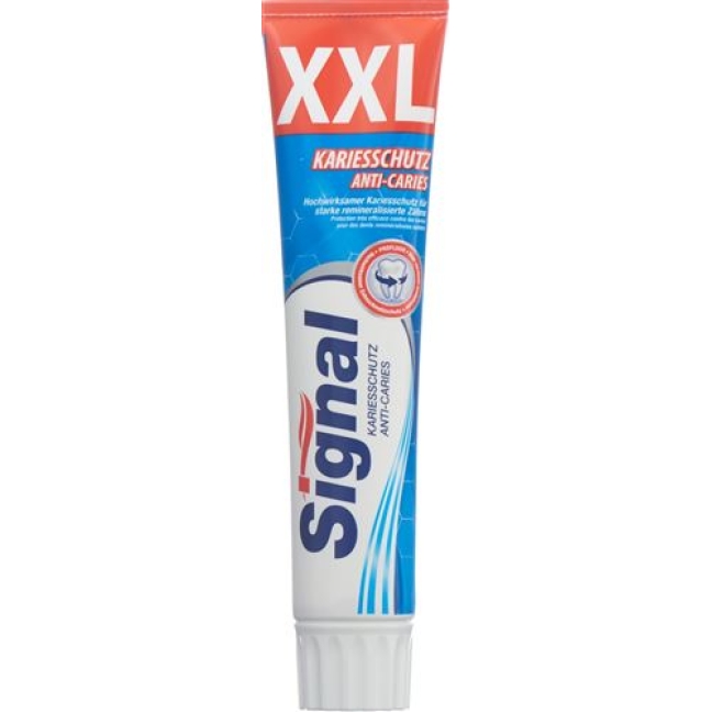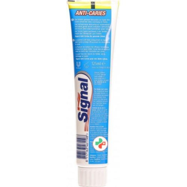 Сигнала анти-Кариес зубная паста владеет клинически проверенная системы округления, связанным, который надежно защищает от кариеса, а также высокоэффективным фторид натрия, который remineralisiert оспариваемые эмаль зубов и затвердевает. Свежий вкус Красной полосой обеспечивает несравнимые чистки зубов, опыт.