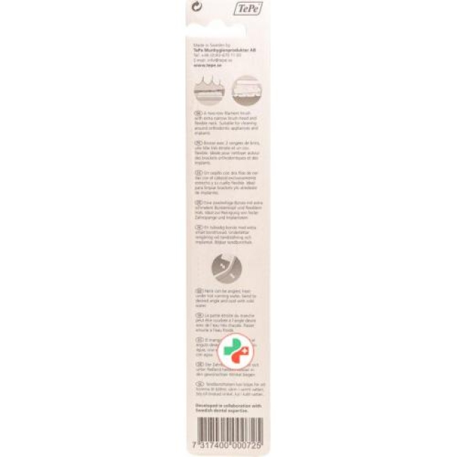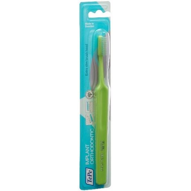 Которые TePe Implant / Orthodontic-это двухрядная щетка с экстра узкая головка щетки и гибкой шеей. Она идеально подходит для чистки твердых брекетов и имплантатов.