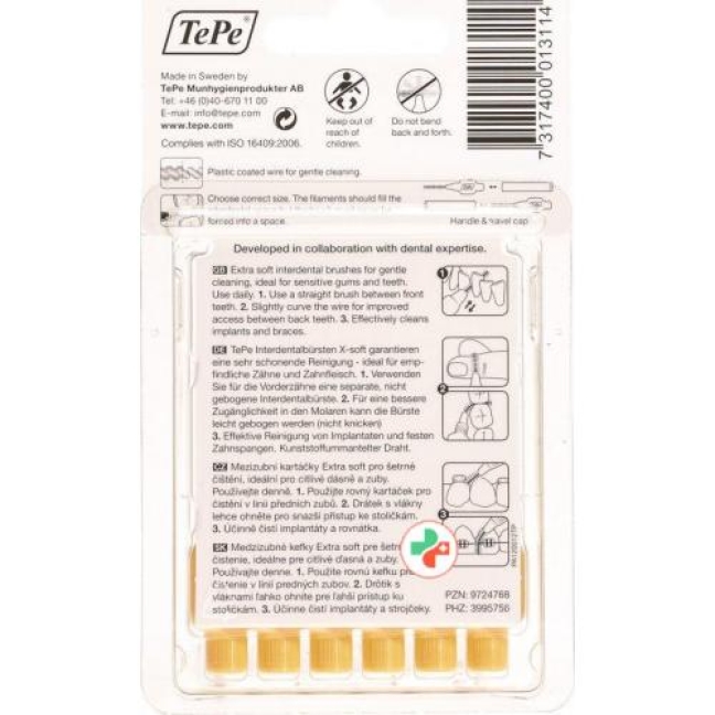 Которые Тепе Interdental щетки X-soft гарантируют очень бережную чистку и поэтому идеально подходит для чувствительных зубов и десен подходит. Для лучшего доступа в молярном щетка может не быть загнуты слегка согнуты, однако. Кроме того, эффективная очистка имплантатов и фиксированных ортодонтических аппаратов гарантировано. Для передних зубов, однако отдельный, не изогнутые межзубные щетки должен быть использован.