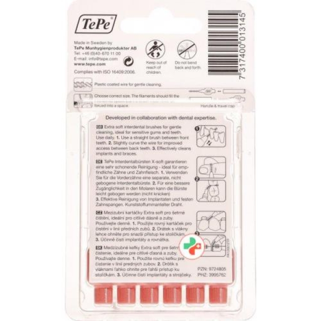 Которые Тепе Interdental щетки X-soft гарантируют очень бережную чистку и поэтому идеально подходит для чувствительных зубов и десен подходит. Для лучшего доступа в молярном щетка может не быть загнуты слегка согнуты, однако. Кроме того, эффективная очистка имплантатов и фиксированных ортодонтических аппаратов гарантировано. Для передних зубов, однако отдельный, не изогнутые межзубные щетки должен быть использован.