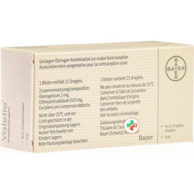 Валетте - это лекарство от гормональной контрацепции, так называемый комбинированный гормональный контрацептив (CHC) или «таблетка». Каждый драже содержит небольшое количество двух разных женских гормонов, а именно диеногест в качестве прогестагена (лютеинизирующий гормон) и этинилэстрадиол в качестве эстрогена.